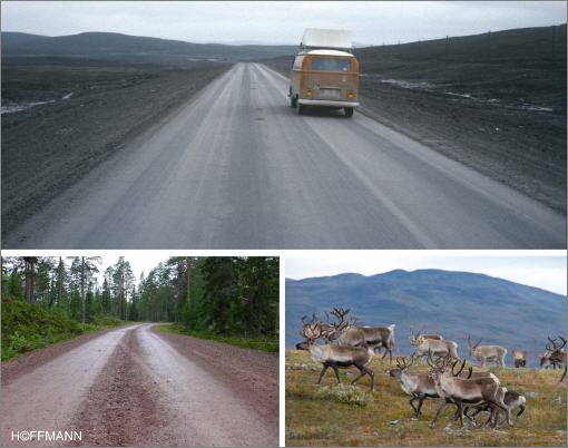 Lappland. Wir erleben sommerlich, schneebedeckte Gipfel und oft direkt am Straßenrand kleine Lager der Samen.