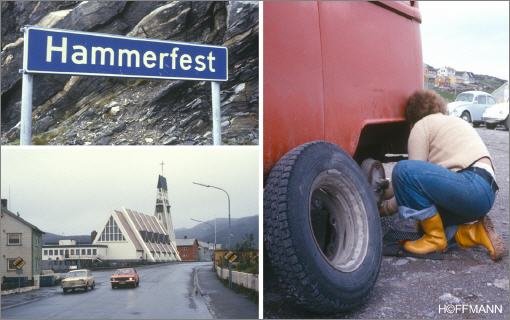 Hammerfest – nördlichste Stadt der Welt. Wir hängen hier tagelang in Kälte und Nieselregen wegen einer Autopanne fest. Dann kommt endlich das ersehnte Ersatzteil.