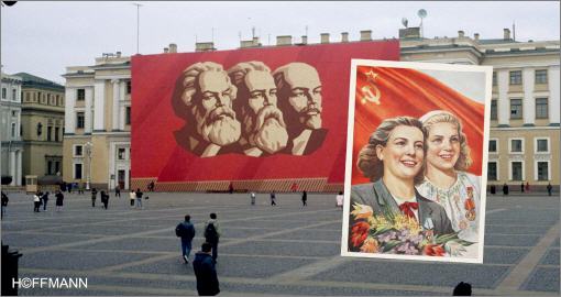 Überall im Land künden zum Teil haushohe Plakatwände vom Ruhm der Partei und des Sozialismus, wie hier auf dem Revolutionsplatz in Leningrad.