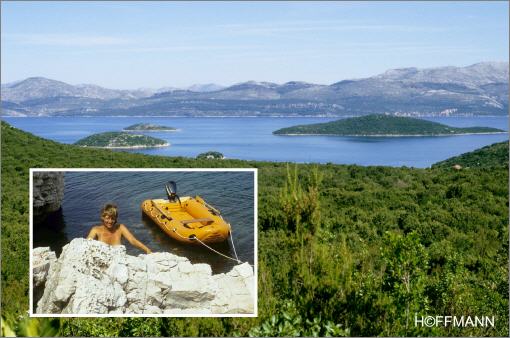 Campingurlaub an der Adria. Mit unserem Schlauchboot kreuzen wir zwischen den kleinen unbewohnten dalmatinischen Inseln vor der Halbinsel Pelješac.