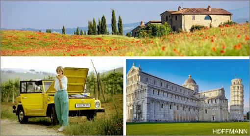Mit unserem quietschgelben Kübelwagen, einem VW 181, unternehmen wir eine wundervolle Reise in die italienische Toskana.