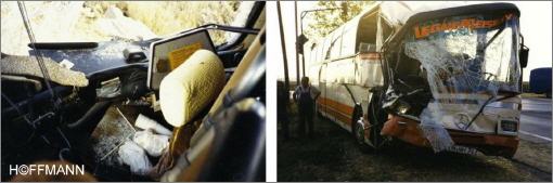 Fahrer und Reisegäste kommen mit geringfügigen Schrammen davon. Für mich ADAC-Rettungsflug und 6 Monate Krankenhaus.