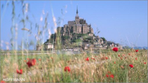 Fast wie ein mystischer Turm aus einem Phantasiefilm ragt die Abtei von Mont-Saint-Michel an der Küste der Normandie vor uns aus dem Meer.