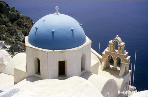Inselhüpfen auf den griechischen Kykladen. Eines der berühmtesten Fotomotive ist dieses Kirchlein auf der Insel Santorin.