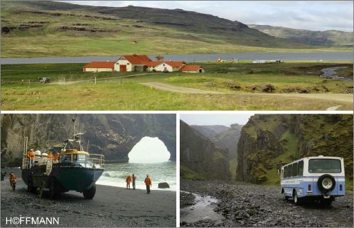 Unterwegs auf Island. Zu Land und auf See mit dem Amphicar an der Dyrhólaey-Halbinsel an der Südküste. Straßen gibt es in der Þórsmörk keine.