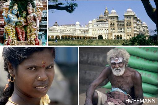 Bunte Götterfiguren, bunte Völkergruppen und der luxoriöse Maharaja-Palast von Mysore.