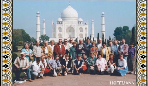 Die Reisegruppe vor dem Taj Mahal, dass der muslimische Großmogul Shah Jahan zum Gedenken an seine im Jahre 1631 verstorbene große Liebe Mumtaz Mahal in Agra errichten ließ.