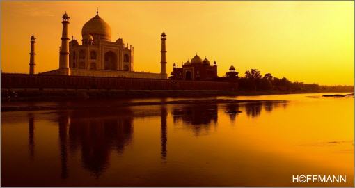 Die Abendsonne lässt den architektonischen Traum des Taj Mahal langsam vergolden und dann schweben wie auf einem gläsernen Teppich.