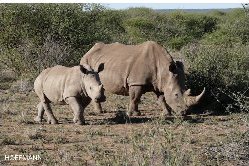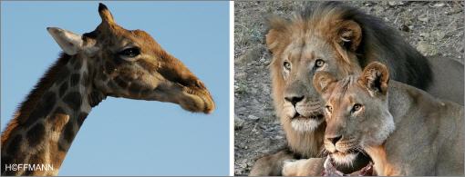 Auf Fotosafari im Etosha-Nationalpark. Mit Geduld und ein wenig Glück gelingen Porträts von Giraffen und Löwen oder ein Familienbild von Mutter Breitmaulnashorn mit Kalb.