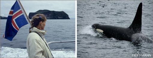 Auf einer Umrundung der Vestmannaeyjar-Inseln überrascht uns direkt neben dem Boot eine kleine Gruppe von Orcas, den berüchtigten Killerwalen.