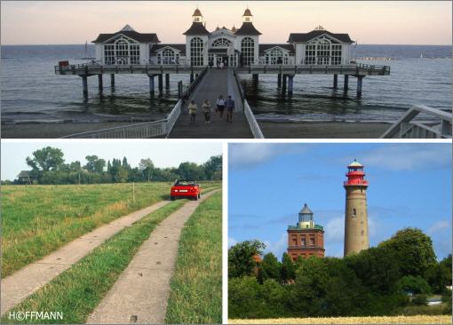 Auf Rügen wohnen wir im Seebad Sellin mit seiner weißen Seebrücke. Unser roter Ford quält sich zum Teil noch über alte „DDR-Fahrwege“. Leuchttürme am Kap Arkona.