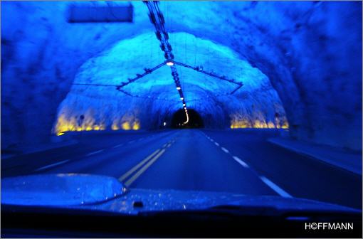 Der Lærdalstunnel in Norwegen ist mit 24,5 km der augenblicklich längste Straßentunnel der Welt. Somit vermeiden wir mit unserer desolaten Motorkühlung die Pass-Tour über den 1300 m hohen, serpentinenreichen, fast 50 km langen Aurland-Snøvegen.