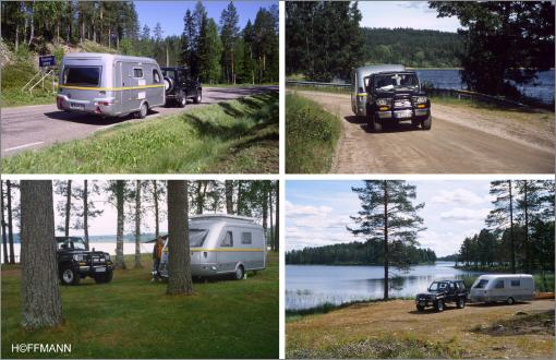 Am liebsten befahren wir in Schweden wieder die schmalen Nebenstraßen oder unbefestigten Pisten. Da und dort finden wir fantastische Übernachtungsmöglichkeiten in Wäldern und an glitzernden Seen.