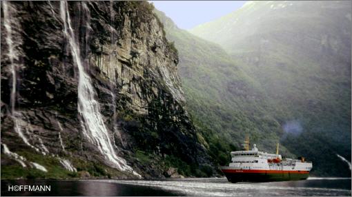 Die MS Narvik unterwegs auf einem Abstecher in den berühmten Geiranger-Fjord auf unserer Reise nach Norden.