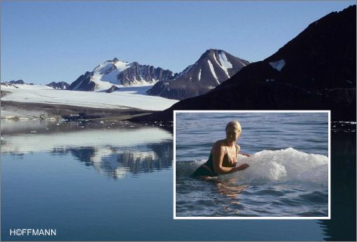 Im Kongsfjorden bei Ny Alesund ist Badespaß mit Eisschollen angesagt. Aber nur das ganz starke Geschlecht stürzt sich ins Eiswasser. Also die Frauen!