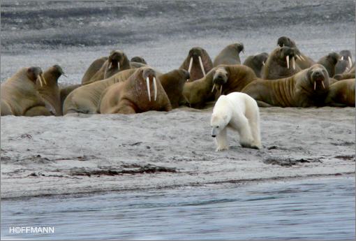 Die schmale Sandbank teilen sich die Walrosse mit dem König der Arktis. Aber nur notgedrungen und mit großer Vorsicht.