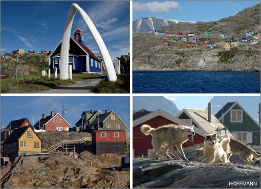 Die blaue Bethel-Kirche von 1775 mit Eingangstor aus einem Wal-Kiefer im Städtchen Sisimiut. Die Inuit-Siedlung Ukkusissat oberhalb der Küste. Bunte Häuser in Uummannaq an der Diskobucht. Schlittenhunde im Örtchen Qeqertarsuaq auf der gleichnamigen Insel.