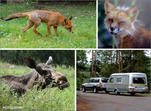 Unsere Campingtour führt uns durch die unendlichen schwedischen Wälder. Hier sagen uns Fuchs und Elch „Gute Nacht“.