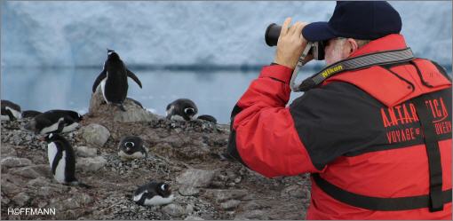 Auf der antarktischen Halbinsel begegnen uns häufig die lustigen Pinguine.