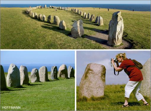 Das „schwedische Stonehenge“. Die 59 Steine von Ales Stenar, die in der Form eines Schiffs angeordnet sind, liegen hoch auf einem Hügel direkt an der südschwedischen Küste von Skåne beim Fischerörtchen Kåseberga.